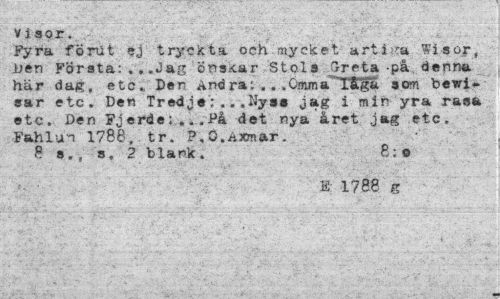 //// Vispr. .-. ¦ -? //// Fyra förut ej tryckta och.mycket artiga Wisor, Den Första: . . .Jag önsxar Stols Greta -på denna här dag, etc., Den And ra i.. .Omm a"* 1'fc'ga som bevisar etc. Den Tredje;...Nyss jag i min yra rasa etc. Den Fjords;...det nya året jag etc. Fahlui 1788, tr. P.O.Axmar. //// 8 s., s. 2 blank. B;o //// E 1788 g ////
