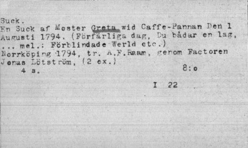 //// Suck. //// En Suck af ^cster <]jffit ^ w-i a Caffe-Pannan Pen 1 Augusti 1794. (Förfärliga dag, Du bådar en lag, ... mel.: Förblindade Werld etc.) Norrköping 1794, tr. A.F.ftaair, genom Factoren Jonas Lctström, (2 ex.) //// 4 3. 8:0 //// I 22 ////