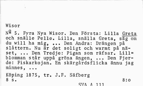 //// Wisor //// N- 5. Fyra Nya Wisor. Den Första: Lilla Greta och snälle Pelle. Lilla, snälla Greta, säg om du will ha mig, ... Den Andra: Drängen på slåttern. Nu är det soligt och warmt på näset, ... Den Tredje: Pigan som räfsar. Lill= blomman står uppå gröna ängen, ... Den Fjer-de: Fiskarkojan. En skärgårdsflicka ännu jag minnes, ... //// Köping 1875, tr. J.F. Säfberg 8 s. 8:o //// C1.T A A 111 ////