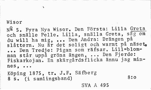 //// Wisor //// N§ 5. Fyra Nya Wisor. Den Första: Lilla Greta och snälle Pelle. Lilla, snälla Greta, säg om du will ha mig, ... Den Andra: Drängen på slåttern. Nu är det soligt och warmt på näset, ... Den Tredje: Pigan som räfsar. Lill=blom-man står uppå gröna ängen, ... Den Fjerde: Fiskarkojan. En skärgårdsflicka ännu jag minnes , ... //// Köping 1875 , tr. J.F. Säfberg 8 s. (i samlingsband) 8:o //// SVA A 495 ////