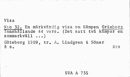 //// Visa //// N:o 32. En märkvärdig visa om Kämpen Grimborg Innehållande 44 vers. (Det satt två kämpar en sommarkväll ...) //// Göteborg 1909, tr. A. Lindgren & Söner 8 s. 8:o //// SVA A 495 ////