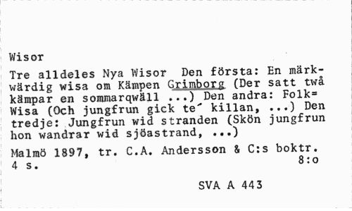 //// Wisor //// Tre alldeles Nya Wisor Den första: En märk-wärdig wisa om Kämpen Grimborg (Der satt twå kämpar en sommarqwäll ...) Den andra: Folk» Wisa (Och jungfrun gick te" killan, ...) Den tredje: Jungfrun wid stranden (Skön jungfrun hon wandrar wid sjöastrand, ...) //// Malmö 1897, tr. C.A. Andersson & C:s boktr. 4 s. 8:0 //// SVA A 44 3 ////
