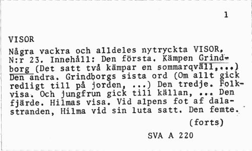 //// 1 //// VISOR //// Några vackra och alldeles nytryckta VISOR, N:r 23. Innehåll: Den första. Kämpen Grind* borg (Det satt två kämpar en sommarqvSIT, Den andra. Grindborgs sista ord (Om allt gick redligt till på jorden, ...) Den tredje. Folkvisa. Och jungfrun gick till källan, ... Den fjärde. Hilmas visa. Vid alpens fot af dalastranden, Hilma vid sin luta satt. Den femte. " //// (forts) //// SVA A 2 20 ////
