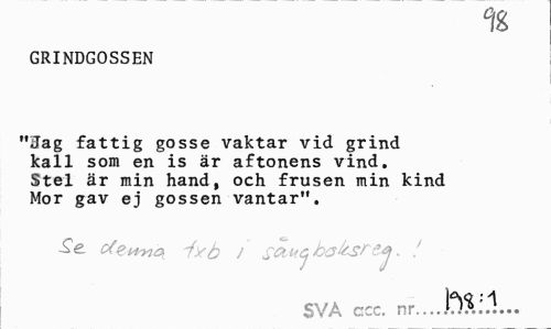 //// % //// GRINDGOSSEN //// "Hag fattig gosse vaktar vid grind kall som en is är aftonens vind. Stel är min hand, och frusen min kind Mor gav ej gossen vantar". //// cfeptwot iyS i sqm^ba&srt*. ! //// SVA ccc. nr.. ////