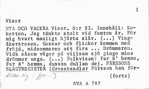 //// 1 //// Visor //// NYA OCH VACKRA Visor. N:r 93. Innehåll: Ko-ketten. Jag tänkte stolt vid femton år. För mig hvart manligt hjärta slår. (...) Vingåkersrosen. Gossar och flickor kommen med fröjd, midsommaren att fira ... Drömmaren. Vida såsom vågor på villsam sjö gingo mina drömmar unga. (...) Folkvisan: Far ä' hemma, Far ä' hemma, dussan dullan dej. PÄRSSONS SLÄGTREGISTER (Grosshandlar Pärsson han för- //// Jk/sAét fy .' Jjor (forts) //// SVA A 78 7 ////