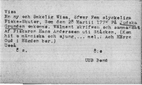 //// Vi sa //// Er? ny och ömkelig Wisa, öfwer Fem olyckeliga Fiske-Skutor, Som den 28 Martii 177c På Judska Grunden omkorme. Wälment skrifwen och sammansatt Af Fi skaren Hans Andersson uti Stacken, (Kom hit o människa och sjung,... mel.; Ach HErre Gud i Höerden bor.) Uo»a //// l s. 8;o //// UUB Bond ////