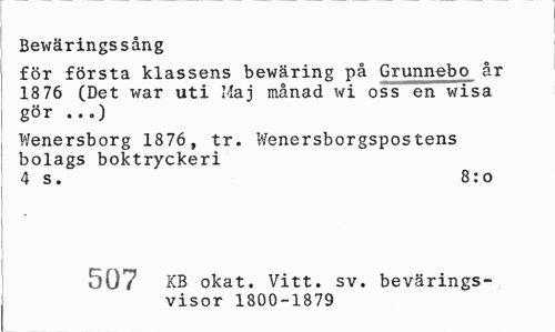 //// Bewäringssång //// för första klassens bewäring på Grunnebo år //// m 0 , mmm...* - rnmmmmm //// 18 76 (Det war uti Maj manad wi oss en wisa gör ...) //// Wenersborg 1876, tr. Wenersborgspostens bolags boktryckeri //// 4 s. 8:o //// 507 KB okat. Vitt. sv. bevärings- //// visor 1800-1879 ////