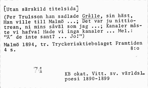 //// [Utan särskild titelsida] //// (Per Trulsson han sadlade Grålle, sin häst, Han ville till Malmö Det var ju nittio- //// trean, ni mins såväl som jag Kanaler mås- //// te vi hafvaj Hade vi inga kanaler ... Mel.: "A" de inte sant? ... Jo]") //// Malmö 1894, tr. Tryckeriaktiebolaget Framtiden 4 s. 8:0 //// 74 //// KB okat. Vitt. sv. världsl- //// poesi 1890-1899 ////