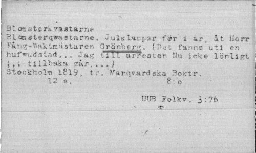 //// Bl ort stift, vaatarne //// Bicaiaterqwastame, -Jultc larmar fér i ar, åt Herr Få.ng-7?akt»fistaren Grönberg. (Bet fanns uti en hufwudstad».. Jag till arr&sten Nu icke lönligt ; , ; ti llbaka ;?ar, , . .) //// Stockholm l8ly, tr. Varqyardska Poktr, 12 s. 8:0 //// UUB Folk v. 3:76 //// x. - //// . f ////