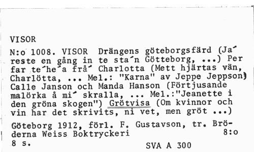 //// VISOR //// N:o 1008. VISOR Drängens göteborgsfärd (Ja' reste en gång in te sta"n Götteborg, ...) Per far te'he'a frå' Charlotta (Mett hjärtas vän, Charlotta, ... Mel.: "Karna" av Jeppe Jeppson) Calle Janson och Manda Hanson (Förtjusande malörka å rai" skralla, ... Mel.:"Jeanette i den gröna skogen") Grötvisa (Om kvinnor och vin har det skrivits, ni vet, men gröt ...) //// Göteborg 1912, förl. F. Gustavson, tr. Bröderna Weiss Boktryckeri 8:0 //// 8 s* SVA A 300 ////