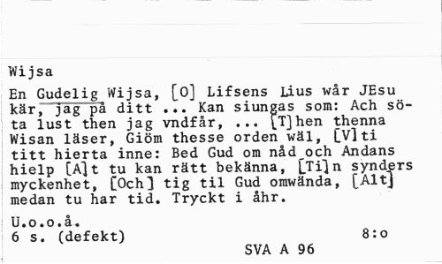 //// Wi jsa //// En Gudelig Wijsa, [0] Lifsens Lius wår JEsu kär, jag på ditt ... Kan siungas som: Ach söta lust then jag vndfår, ... [Tjhen thenna Wisan läser, Giöm thesse orden wäl, C V] ti titt hierta inne: Bed Gud om nådoch Andans hielp [Alt tu kan rätt bekänna, [Tiln synders myckenhet, [Och] tig til Gud omwända, [Altj medan tu har tid. Tryckt i åhr. //// U.o.o.å. //// 6 s. (defekt) 8:0 //// SVA A 96 ////