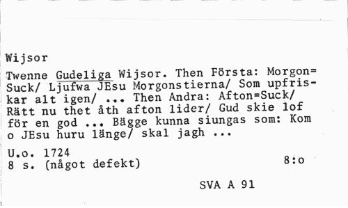 //// Wijsor //// Twenne Gudeliga Wijsor. Then Första: Morgon= Suck/ Ljufwa JEsu Morgonstierna/ Som upfriskar alt igen/ ... Then Andra: Afton=Suck/ Rätt nu thet åth afton lider/ Gud skie lof för en god ... Bägge kunna siungas som: Kom o JEsu huru länge/ skal jagh ... //// U.o. 1724 //// 8 s. (något defekt) 8:0 //// SVA A 91 ////