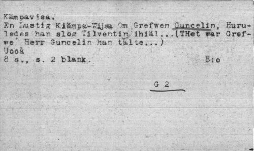 //// -täreoav is». //// En Lustig Kiärnpa-Tijsi Om Grefwen JjyafieJUn, Kuru-ledes han slosr Ti lventin. ihiäl.. . (THet var Gref-ve Herr Guncelin han talte...) Uooa _ //// 8 s., s. 2 blank. //// G 2 //// i ////