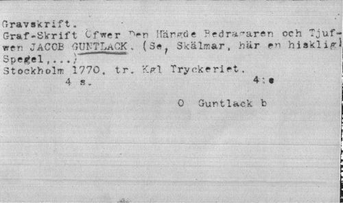 //// Gravskrift. //// Graf-Skrift Cfwer ^ti Hängde Bedragaren ceh Tjuf-wen JACOB GUNTLACK. Skälmar, här en hisklig- //// Spegel,...}' //// Stockholm 1770. tr. .Kgl Tryckeriet. //// 4 s . 4 : • //// O Guntlack b ////