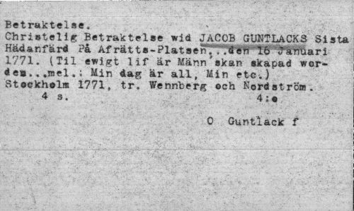 //// Betraktelse. //// Christelig Betraktelse wid JACOB GUNTLACKS Sista Hädanfard På Afrätts-PlatsenT.-.deh 16 Januari 17.71. (Til ewigt lif är Människan skapad wor-d e». ..mel.; Min dag ar all, Min etc.) Stockholm 1771, tr. Wennberg och Nordström. 4 s. 4 :o //// 0 Guntlack f ////