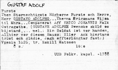 //// tkxsöcf //// Furste //// Then Storaechtigste Högborne Furste och Herre t Herr GUSTaVO ADOLPHO...The^na Rrigzmans Wijsa til ähra...Componerat Aff ERTCO JOHANNIS Falk Ostrogotho. (GU3TAVE ADOLPHE Swen3ke sköld oc bij standl,.., mel.: Ein Soldat ist vor handen, .rtllhier vor diesem Hauss: Eller Ack hiertans tröst och glädie, Jagh effterlängtar fast;) Vpsala 1626, tr. Eskiil Matsson //// 8 s.' 16:o //// . UUB Folkv. kapal. .1758 ////