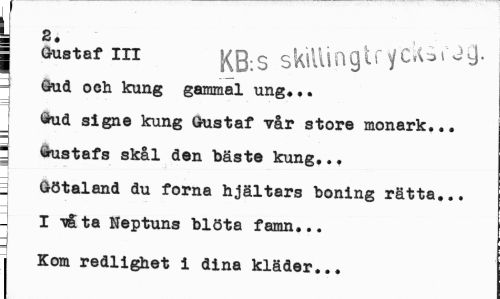 //// y 2. //// i Gustaf in Kg.s skillingtryou^y- //// - Gud och kung gammal ung, •. //// E3 //// öud signe kung Gustaf vår store monark... //// ¦i //// j öustafs skål den bäste kung... _ Götaland du forna hjältars boning rätta... I rå ta Neptuns blöta famn... //// j //// Kom redlighet i dina kläder... ////