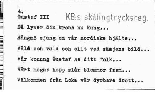 //// I 4. //// I Gustaf iii KB:S s killi n g t r y eks T a g, //// = Så lyser din krona nu kung... //// = Sångmö sjung om vår nordiske hjälte... //// | //// 1 ¥åiå och väid och allt vad sämjans bild... //// vår konung öustaf se ditt folk... //// [ Vårt mogna hopp slår blotumor fram... //// fi Välkommen från Loka vår dyrbare drott... i //// i ___ ////