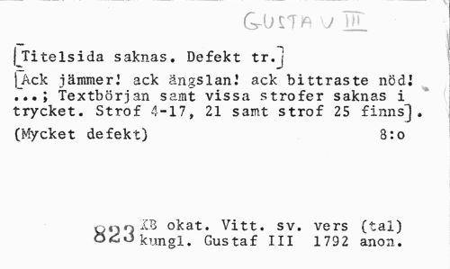//// GrlKTft j J1L //// (Titelsida saknas. Defekt tr.j //// |_Ack jämmer] ack ängslan.' ack bittraste nöd.1 ... ; textbörjan samt vissa strofer saknas i trycket. Strof 4-17, 21 samt strof 25 finns]. //// (Mycket defekt) 8:o //// nno IB okat. Vitt. sv. vers (tal) //// O <2 o kungl. Gustaf III 1792 anon. ////