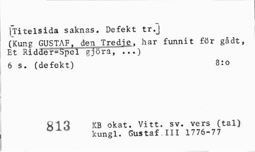 //// (Titelsida saknas. Defekt tr.J //// (Kung GUSTAF, den Tredje, har funnit för gådt, Et Ridder=Spel gjöra," ...) //// 6 s. (defekt) 8:0 //// H13 KB okat. Vitt. sv. vers (tal) //// kungl. Gustaf.III 1776-77 ////