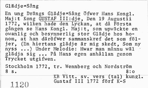 //// Glädjesång //// En ung Drängs Glädje=Sång öfwer Hans Kongl. Maj:t Kong GUSTAF III:dje, Den 19 Augustii 1772, wilken hade den Lyckan, at då Första gången se Hans Kongl. Maj:t, som upwäckte en owanlig och besynnerlig stor Glädje hos honom, at han däröfwer sammanskref det som följer, (En hiertans glädje är mig skedt, Som ny nyss ...) Under Melodie: Hwar man månnu wäl glädja sig ... På Hans egen anhållan genom Trycket utgifwen. //// Stockholm 1772, tr. Wennberg och Nordström 8 s. 8: o //// KB Vitt. sv. vers (tal) kungLT^ . , Gustaf III 1772 förf K-S ////