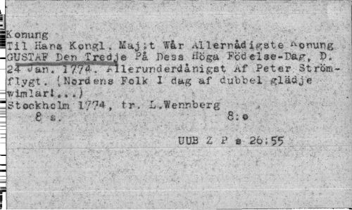 //// SK onung //// Hil Kana Kongl. Maj;t Wår Allernådigste ^onung ¦GUSTAF Den tredje På Besa Höga Födelse-Dag, D. -24 Jan." Ty/fT^ileruriderdåniget Af Peter, ätröm-flygt. [ Nord ens Folk I dag af dubbel glädje = nvim!ari.« .) //// 'Stockhcln l'/?4, tr. L.Wennberg //// 8 s. 8;o //// : UUB 2 P a 26; 55 //// ¦ //// •V •' r '. .. 1 ¦•¦.. . ¦ .-v1. . • - ////