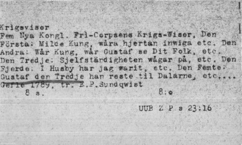 //// I , V . V • • / •• //// Crigsvisor | //// Fem %a Kongl» Fri-Ccrps*ns Krigs-Wisor, Den Persta; Milce Kung, wåra hjertan inwiga etc, Deh knåra; Wår Kurg. wår Gustaf se Dit Folk, etc.. Den Tredje; Sjelfständigheten wågar på, etc. Den Fjerde; I Husby har jag frarit, etc. Den Femte; Gustaf den Tredje han reste til Dalarne^ etc,... jHJ 1!! lV^l^T. Sv n<jet //// 8 s . 8;o //// UUB Z P s 23:16 ////
