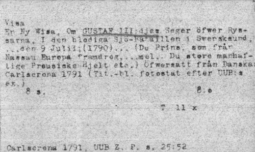 //// Vi »a - //// yy mw ULM*1 öfwer Rys- //// sarna , I den blod i sta. fJo-Ta1^? Hen t Svensksund //// , , .den 9 Juli - ;(1790», . . {»« Prins.' »om fri* //// N*aaa-u Rurop* ^amtirig, . , ,«el,. Du store »»nbaf- //// Uäc Pr sus i ske Hjelt etc.} öfw^rsatt från Danske //// Carladrena 1791 (Tit.-bl. fotostat efter UUB-a //// ' -« *> ¦ * ' 8: o ; //// T 11 x //// fiK.rl 17.;t TfTTti 7 O - <Se». a ////