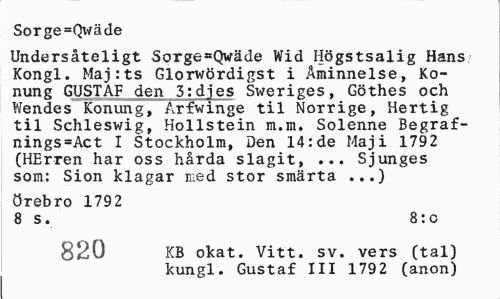 //// Sorge=Qwäde //// Undersåteligt SorgeaQwäde Wid Högstsalig Hans' Kongl. Maj:ts Glorwördigst i Åminnelse, Konung GUSTAF den 3:djes Sweriges, Göthes och Wendes Konung, Ärfwinge til Norrige, Hertig til Schleswig, Hollstein m.m. Solenne Begraf-nings=Act I Stockholm, Den 14:de Maj i 1792 (HErren har oss hårda slagit, ... Sjunges som: Sion klagar med stor smärta ...) //// Örebro 1792 //// 8 s. 8: o //// oiq KB okat. Vitt. sv. vers (tal) //// OJ"° kungl. Gustaf III 179 (anon) ////