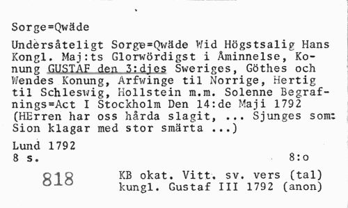 //// Sorge=Qwäde //// Undersåteligt Sorge=Qwäde Wid Högstsalig Hans Kongl. Maj:ts Glorwördigst i Åminnelse, Konung GUSTAF den 3:dies Sweriges, Göthes och Wendes Konung, Årfwinge til Norrige, Hertig til Schleswig, Hollstein m.m. Solenne Begraf-nings=Act I Stockholm Den 14:de Maj i 1792 (HErren har oss hårda slagit, ... Sjunges somt Sion klagar med stor smärta ...) //// Lund 1792 //// 8 s. 8:o //// oiq KB okat. Vitt. sv. vers (tal) //// OJ"° kungl. Gustaf III 1792 (anon) ////