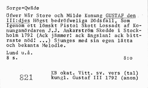//// Sorge=Qwäde //// öfwer Wår Store och Milde Konung GUSTAF den III:djes Högst bedröfweliga Dödsfall, Som Igenom ett lömskt Pistol Skott Lossadt af Konungamördaren J.J. Ankarström Skedde i Stockholm 1792 (Ack jämmer] ack ängslan! ack bittraste nöd! ...) Sjunges med sin egen lätta och bekanta Melodie. //// Lund u.å. //// 8 s. 8:0 //// oiq KB okat. Vitt. sv. vers (tal) //// OJ"° kungl. Gustaf III 1792 (anon) ////