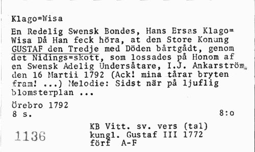//// Klago=IVisa //// En Redelig Swensk Bondes, Hans Ersas Klago= Wisa Då Han feck höra, at den Store Konung GUSTAF den Tredje med Döden bårtgådt, genom det Nidings=skott, som lossades på Honom af en Swensk Adelig Undersåtare, I.J. Ankarström,, den 16 Martii 1792 (Ack! mina tårar bryten fram.' ,..) Melodie: Sidst när på ljuflig blomsterplan ... //// Örebro 1792 //// 8 s. 8;o //// KB Vitt. sv. vers (tal) //// 1135 kungl. Gustaf III 17 72 //// förf A-F ////