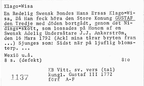 //// Klago=Wisa //// En Redelig Swensk Bondes Hans Ersas Klago-Wi-sa, Då Han feck höra den Store Konung GUSTAF den Tredje med döden bortgådt, genom det Ni-dings=skott, som lossades på Honom af en Swensk Adelig Undersåtare J.J. Ankarström, den 16 Mars 1792 (Ack! mina tårar bryten fram ...) Sjunges som: Sidst när på ljuflig bloms-terp. ... //// Wexiö u.å. //// 8 s. (defekt) 3:o //// KB Vitt. sv. vers (tal) //// i ^ on kungl. Gustaf III 1772 //// } _LO/ förf a-F ////