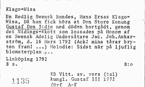 //// Klago=IVisa //// En Redlig Swensk Bondes, Hans Ersas Klago= Wisa, Då han fick höra at Den Store Konung Gustaf Den 3:dje med döden bortgådt, genom det Nidings=skott som lossades på Honom af en Swensk Adelig Undersåtare Jac. Joh.Ankarström, d. 16 Mars 1792 (Ackl mina tårar bry-ten fram! ...) Melodie: Sidst när på ljuflig blomsterplan ,„. //// Linköping 1792 //// 8 s. 8:o //// KB Vitt. sv. vers (tal) //// 1135 kungl. Gustaf III 17 72 //// förf A-F ////