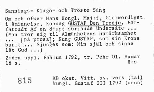 //// Sannings= Klago= och Tröste Sång //// Om och öfwer Hans Kongl. Maj:-t, Glorwördigst i åminnelse, Konung GUSTAF Den Tredje. För-fattadt Af en djupt sörjande Undersate ... (Man tror sig til Almänhetens upmärksamhet ... fpå prosa]; Kung GUSTAF, som sin Krona burit*... Sjunges som: Min själ och sinne låt Gud ...) //// 2:dra uppl. Fahlun 1792, tr. Pehr 01. Axmar 16 s. 8:o //// pic KB okat. Vitt. sv. vers (tal) //// 0±0 kungl. Gustaf III 179 2 (anon) ////