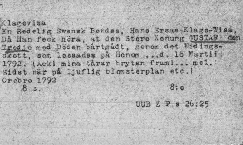 //// K lagovisa . - //// En Redelig Swensk Bondes, Hans Srsas Kla^o-^isa, Då Han feck höra, at den Store Konung. tOSI^?: fen ^r.ed.ie med I)öden bårtgådt, genom det lTid ings-zfkott, som lossades på Honcm . . .d „ 16 Martti 1792. (Ack 1 mina tårar bryter. framl.«. ' //// Sid st när pa ljuflig blomsterplan etc.) Örebro 1792 //// , 8 3.: : ' 8; 0 ¦ //// UUB Z P.s 26:25 ////