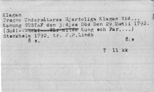 //// . ¦ //// Klagan //// Trogne Underaatarea Hjerteliga Klagan Wid... Konung SUSTAf den Jidjea Död Den 29-Marti i 1792. ( 3ud 1 - - -rrwirt--«« r»'K '119 'l' Kung och Far,...) Stockholm. 1792, tr. J .P.Lindh //// 8 s. 8; • //// T 11 k le ////
