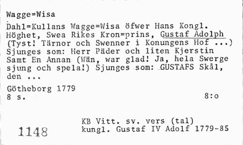 //// Wagge=Wisa //// bahl=Xullans Wagge=Wisa öfwer Hans Kongl. Höghet, Swea Rikes Kron=prins, Gustaf Adolph (Tyst! Tärnor och Swenner i Konungens Hof ...) Sjunges som: Herr Päder och liten Kjerstin Samt En Annan (V/än, war glad.* Ja, hela Swerge sjung och spela.') Sjunges som: GUSTAFS Skål, den ... //// Götheborg 177S //// 8 s. 8:0 //// KB Vitt. sv. vers (tal) //// 1148 kungl. Gustaf IV Adolf 1779-85 ////