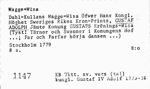 //// Wagge*Wisa //// Dahl=Kullans Wagge=Wisa öfwer Hans Kongl. Höghet Sweriges Rikes Kron^Prints, GUSTAF ADOLPH Jämte Konung GUSTAFS Krönings»Wisa (Tyst.' Tärnor och Swenner i Konungens Hof Far och Farfar böria dansen ...) //// Stockholm 1779 //// 8 s. 8:0 //// 1147 KB Vitt. sv. vers (tal) //// kungl. Gustaf IV Adolf 17 7J-3S ////