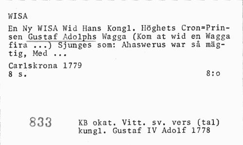 //// WISA //// En Ny WISA Wid Hans Kongl. Höghets Cron=Prin-sen Gustaf^Adolphs Wagga (Kom at wid en Wagga fira ...) Sjunges som: Ahaswerus war så mäg-tig, Med ... //// Carlskrona 1779 //// 8 s. 8:0 //// 833 KB okat. Vitt. sv. vers (tal) //// kungl. Gustaf IV Adolf 1778 ////