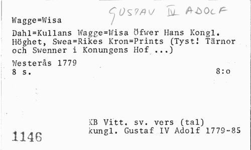 //// Wagge=Wisa //// Dahl=Kullans Wagge=Wisa öfwer Hans Kongl» Höghet, Swea=Rikes Kron=Prints (TystI Tärnor och Swenner i Konungens Hof ...) //// Westerås 1779 //// 8 s. 8:0 //// KB Vitt. sv. vers (tal) //// Ij^p. kungl. Gustaf IV Adolf 1779-85 ////