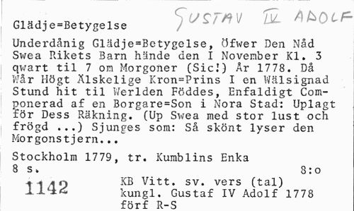 //// Glad;je=Betygelse //// Underdånig Glädje=Betygelse, t5fwer Den Nåd Swea Rikets Barn hände den I November Kl. 3 qwart til 7 om Morgoner (Sicl) Ar 1778. Då Wår Högt Älskelige Kron=Prins I en Wälsignad Stund hit til Werlden Föddes, Enfaldigt Com-ponerad af en Borgare=Son i Nora Stad: Uplagt för Dess Räkning. '(Up Swea med stor lust och frögd ...) Sjunges som: Så skönt lyser den Morgonstjern... //// Stockholm 1779, tr. Kumblins Enka 8 s%, 8: o //// mq KB Vitt. sv. vers (tal) //// kungl. Gustaf IV Adolf 1778 //// ffirf R-S ////