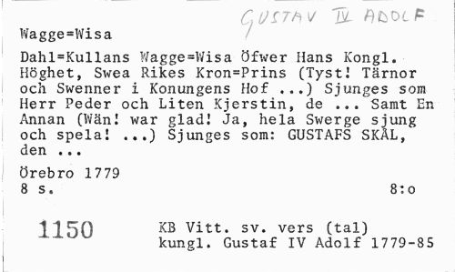 //// C, Q£Th i/ m. F //// Wagge=Wisa //// Dahl=Kullans Wagge=Wisa öfwer Hans Kongl. Höghet, Swea Rikes Kron=Prins (Tyst! Tärnor och Swenner i Konungens Hof ...) Sjunges som Herr Peder och Liten Kjerstin, de ... Samt En Annan (Wän! war glad! Ja, hela Swerge sjung och spela! ...) Sjunges som: GUSTAFS SKÄL, den ... //// Örebro 1779 //// 8 s. 8:0 //// 1150 KB vitt. sv. vers (tal) //// kungl. Gustaf IV Adolf 1779-85 ////