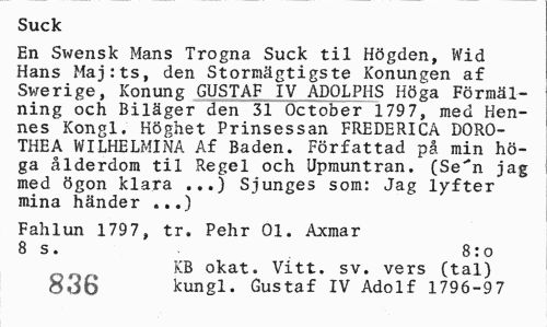 //// Suck //// En Swensk Mans Trogna Suck til Högden, Wid Hans Maj:ts, den Stormägtigste Konungen af Swerige, Konung GUSTAF IV ADOLPHS Höga Förmäl-ning och Biläger den 31 October 1797, med Hennes Kongl. Höghet Prinsessan FREDERICA DORO-THEA WILHELMINA Af Baden. Författad på min höga ålderdom til Regel och Upmuntran. (Se"n jag med ögon klara ...) Sjunges som: Jag lyfter mina händer ...) //// Fahlun 1797, tr. Pehr 01. Axmar 8 s. 8:o //// KB okat. Vitt. sv. vers (tal) 836 kungl. Gustaf IV Adolf 1796-97 ////