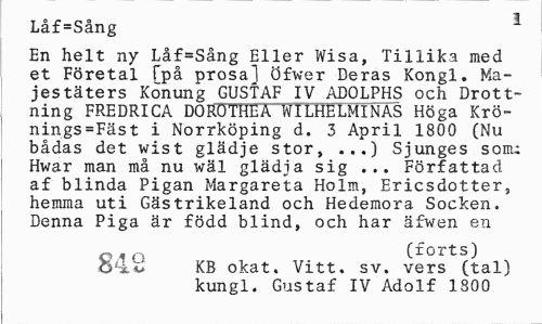 //// Låf=Sång ~ //// En helt ny Låf=Sång Eller Wisa, Tillika med et Företal Tpå prosa] öfwer Deras Kongl. Majestäters Konung GUSTAF IV ADOLPHS och Drottning FREDRICA DOR0THEA WILHELMINAS Höga Krö-nings=Fäst i Norrköping d. 3 April 1800 (Nu bådas det wist glädje stor, ...) Sjunges som: Hwar man må nu wäl glädja sig ... Författad af blinda Pigan Margareta Holm, Ericsdotter, hemma uti Gästrikeland och Hedemora Socken, Denna Piga är född blind, och har äfwen en //// (forts) //// o4 o KB okat. Vitt. sv. vers (tal) //// kungl. Gustaf IV Adolf 1800 ////