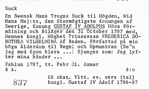 //// Suck //// En Swensk Mans Trogna Suck til Högden, Wid Hans Maj:ts, den Stormägtigste Konungen af Swerige, Konung GUSTAF IV ADOLPHS Höea För-mälning och Biläger den 31 October 1797 med, Hennes Kongl. Höghet Prinsessan FREDERICA D0-ROTHEA WILHELMINA Af Baden. Författad på min höga ålderdom til Regel och Upmuntran (Se^n jag med ögon klara ...) Sjunges som: Jag lyfter mina händer ... //// Fahlun 1797, tr. Pehr 01. Axmar 8 s. 8:o //// KB okat. Vitt. sv. vers (tal) //// 839 kungl. Gustaf IV Adolf 1796-97 ////
