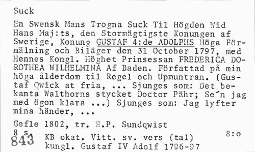 //// Suck //// En Swensk Mans Trogna Suck Til Högden Wid Hans Maj:ts, den Stormägtigste Konungen af Swerige, Konung GUSTAF 4:de ADOLPHS Höga För-mälning och Biläger den 31 October 1797, med Hennes Kongl. Höghet Prinsessan FREDERICA D0-ROTHEA WILHELMINA Af Baden. Författad på min höga ålderdom til Regel och Upmuntran. (Gustaf Qwick at fria, ... Sjunges som: Det bekanta Walthorns stycket Doctor Pähr; Se^n jag med ögon klara ...) Sjunges som: Jag lyfter mina händer, ... //// Gefle 1802, tr. E.P. Sundqwist //// o V5'} KB okat. Vitt. sv. vers (tal) 8:0 //// kun cl. Gustaf IV Adolf 1796-97 ////