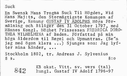 //// Suck //// En Swensk Mans Trogna Suck Til Högden, Wid Hans Maj:ts, den Stormägtigste Konungen af Swerige, Konung GUSTAF IV ADOLPHS Höga För-mälning och Biläger den 31 October 1797, med Hännes Kongl. Höghet Prinsessan FREDRICA DORO-THEA WILHELMINA af Baden. Författad på min höga ålderdom til Regel och Upmuntran. (Se"n jag med ögon klara ...) Sjunges som: Jag lyfter mina händer, ... //// Stockholm 1802, tr. Andreas J. Sylvenius 8 s. 8:o //// KB okat. Vitt. sv. vers (tal) //// 839 kungl. Gustaf IV Adolf 1796-97 ////