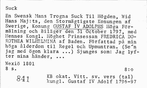 //// Suck //// En Swensk Mans Trogna Suck Til Högden, Wid Hans Majrts, den Stormägtigste Konungen af Swerige, Konung GUSTAF IV ADOLPHS Höga För-mälning och Biläger den 31 October 1797, med Hennes Kongl. Höghet Prinsessan FREDRICA DQ-ROTHEA WILHELMINA af Baden. Författad på min höga ålderdom til Regel och Upmuntran. (Se'n jag med ögon klara ...) Sjunges som: Jag lyfter mina händer, ... //// Wexiö 1801 //// 8 s. 8 : o //// p/41 KB okat. Vitt. sv. vers (tal) //// t kungl. Gustaf IV Adolf 1796-97 ////