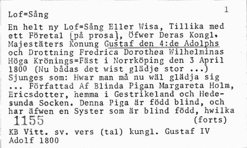 //// Lof=Sång //// En helt ny Lof=Sång Eller Wisa, Tillika med ett Företal [på prosa}, Öfwer Deras Kongl. Majestäters Konung Gustaf den 4:de Adolphs och Drottning Fredrica Dorothea Wilhelminas Höga Krönings=Fäst i Norrköping den 3 April 1800 (Nu bådas det wist glädje stor ...) Sjunges som: Hwar man må nu wäl glädja sig ... Författad Af Blinda Pigan Margareta Holm, Ericsdotter, hemma i Gestrikeland och Hedesunda Socken. Denna Piga är född blind, och har äfwen en Syster som är blind född, hwilka //// 1155 (forts) //// KB Vitt. sv. vers (tal) kungl. Gustaf IV //// Adolf 1800 ////